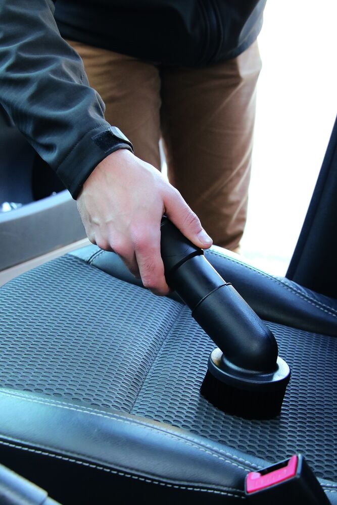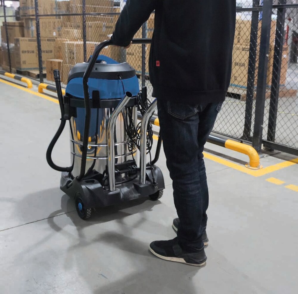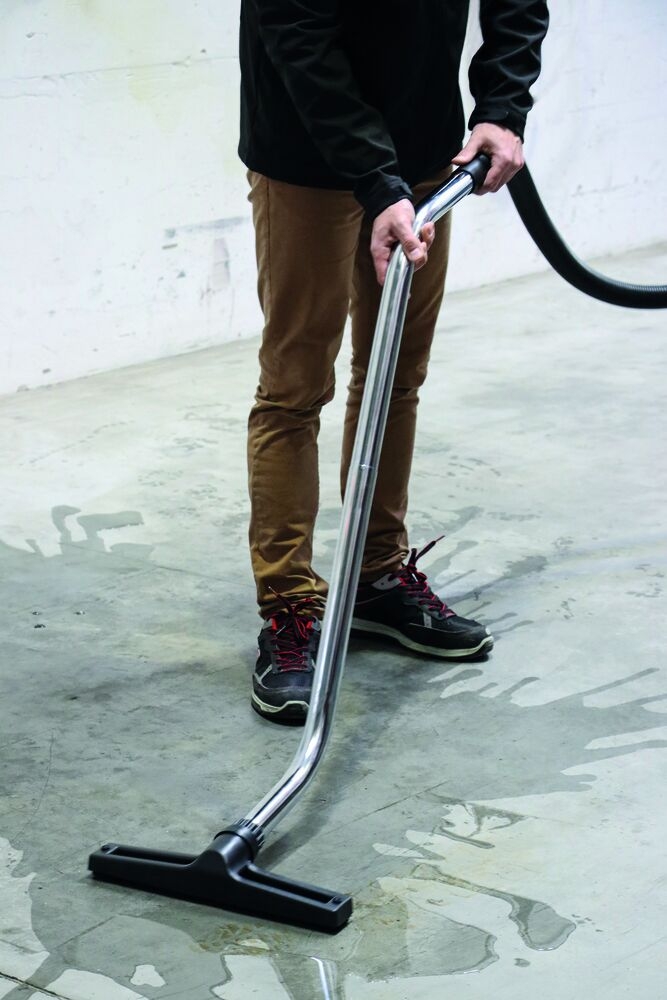 Aspirateur équipé d'un tuyau de vidange, de larges clips de fermeture, d'un porte accessoires, d'un range tuyau.