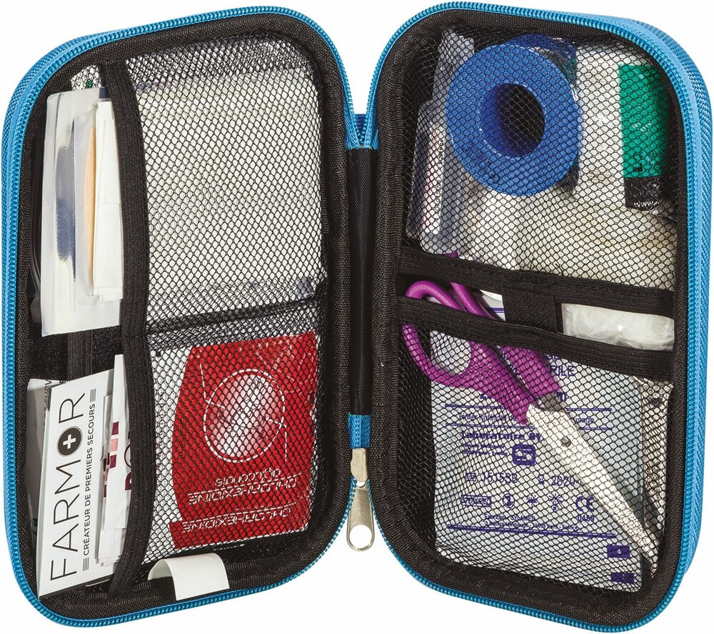 Trousse en EVA bleu fluorescent avec croix rétro-réfléchissante EN 471.
