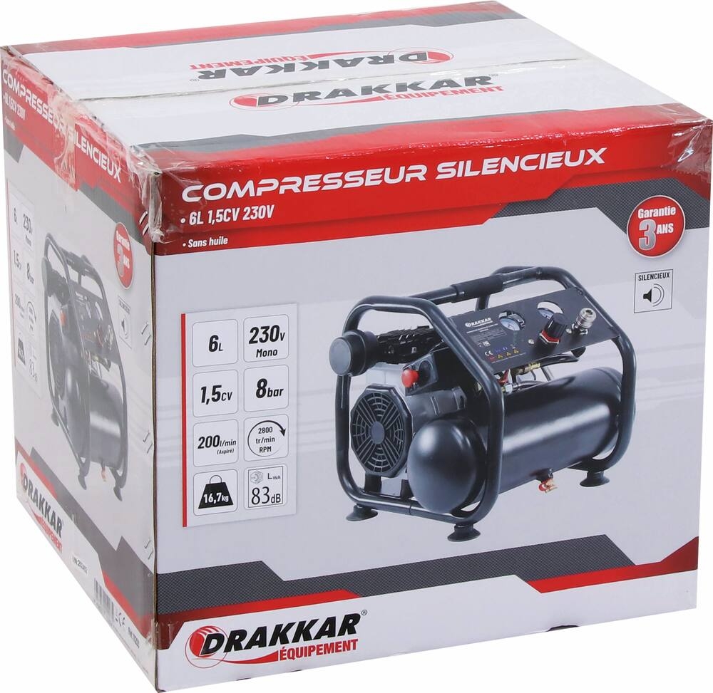 Compresseur silencieux 6L 8 bar 1,5CV 230V sans huile